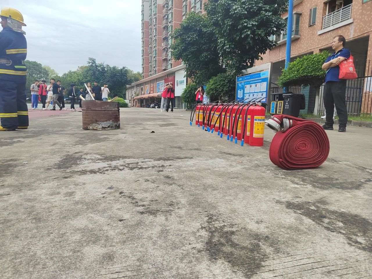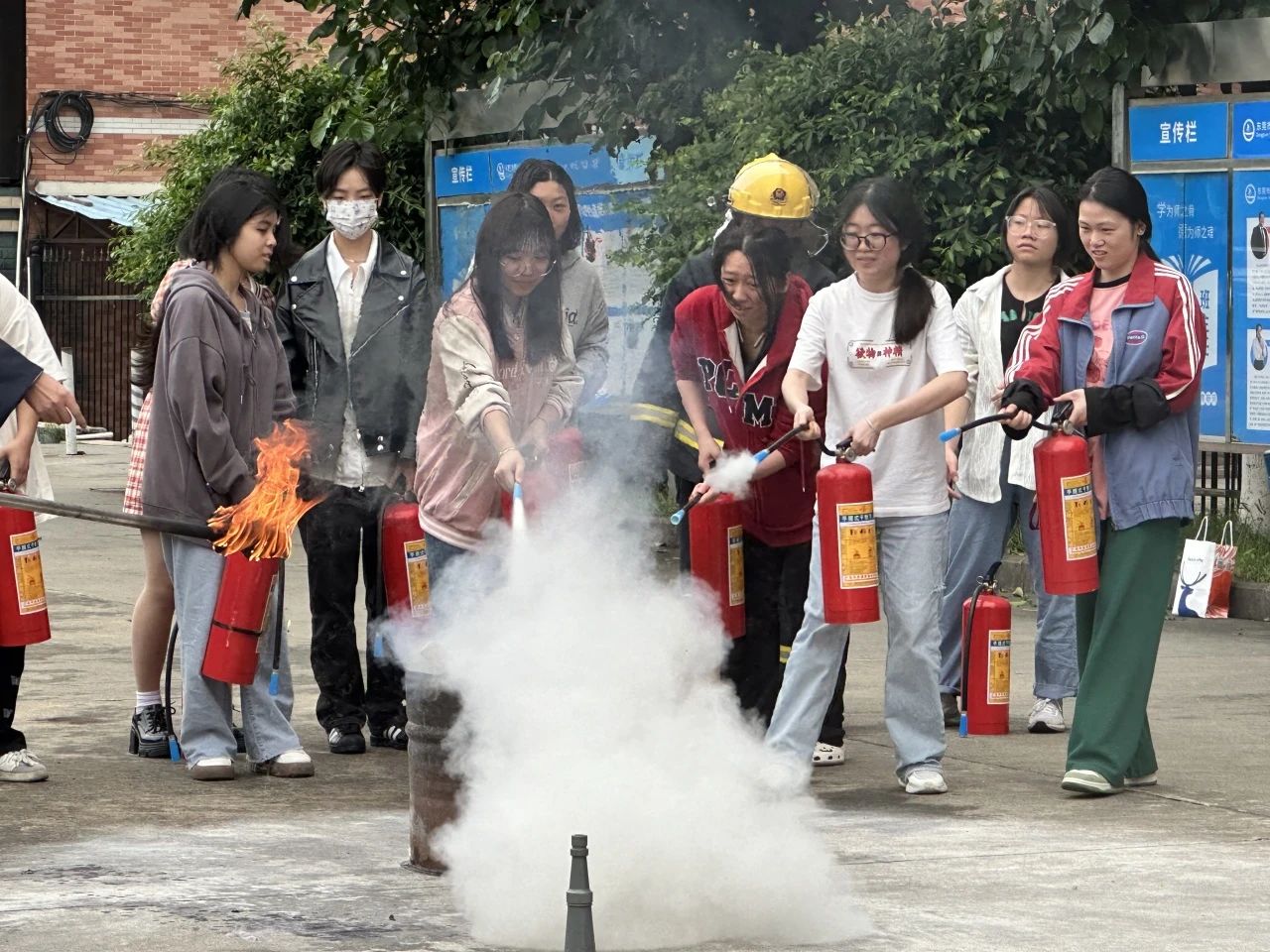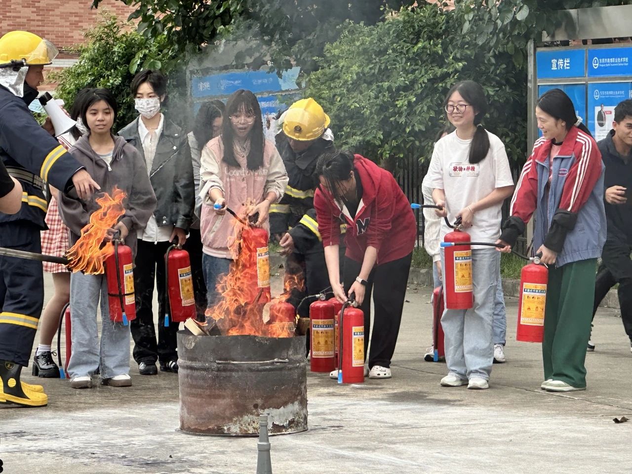 学生到达安全点集合后,消防专员通过现场演示灭火器、消防水带等设备的正确使用方法,同时消防专员使用灭火器对模拟起火点进行火灾扑救演练,随后也让师生参与灭火实战演练。